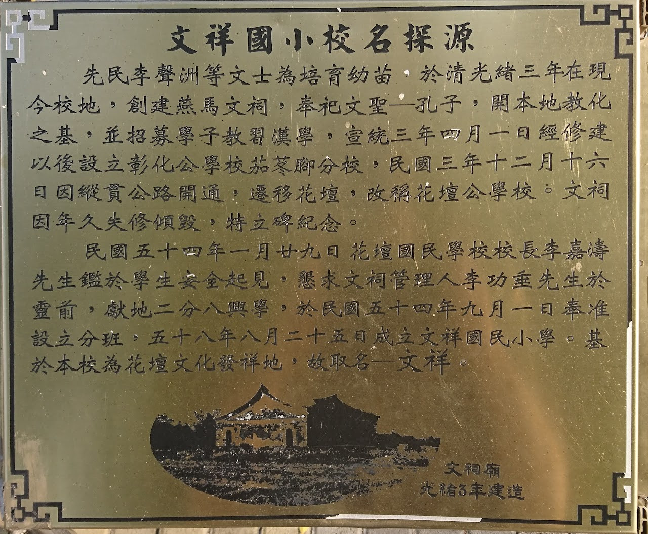 民國五十四年一月廿九日花壇國民學校校長李嘉濤先生鑑於學生安全起見,懇求文祠管理人李功垂先生於靈前獻地二分八厘興學。於民國五十四年九月一日奉准設立分班,基於為花壇文化發祥地,故取名─文祥,民國五十八年奉准設立為文祥國民小學。