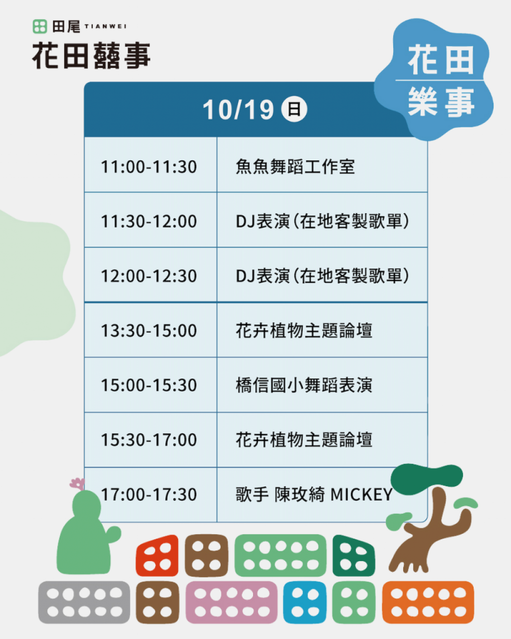 一、「2025台灣設計展」系列活動(((田尾行|花田囍事)))即將在114年10月18日、19日10:00-18:00在隆盛樹化玉博物館舉辦「花田集市」及「花田樂事」活動,內容包含在地商家花卉植栽市集與現場音樂表演,邀請民眾及同仁共度花田假期。