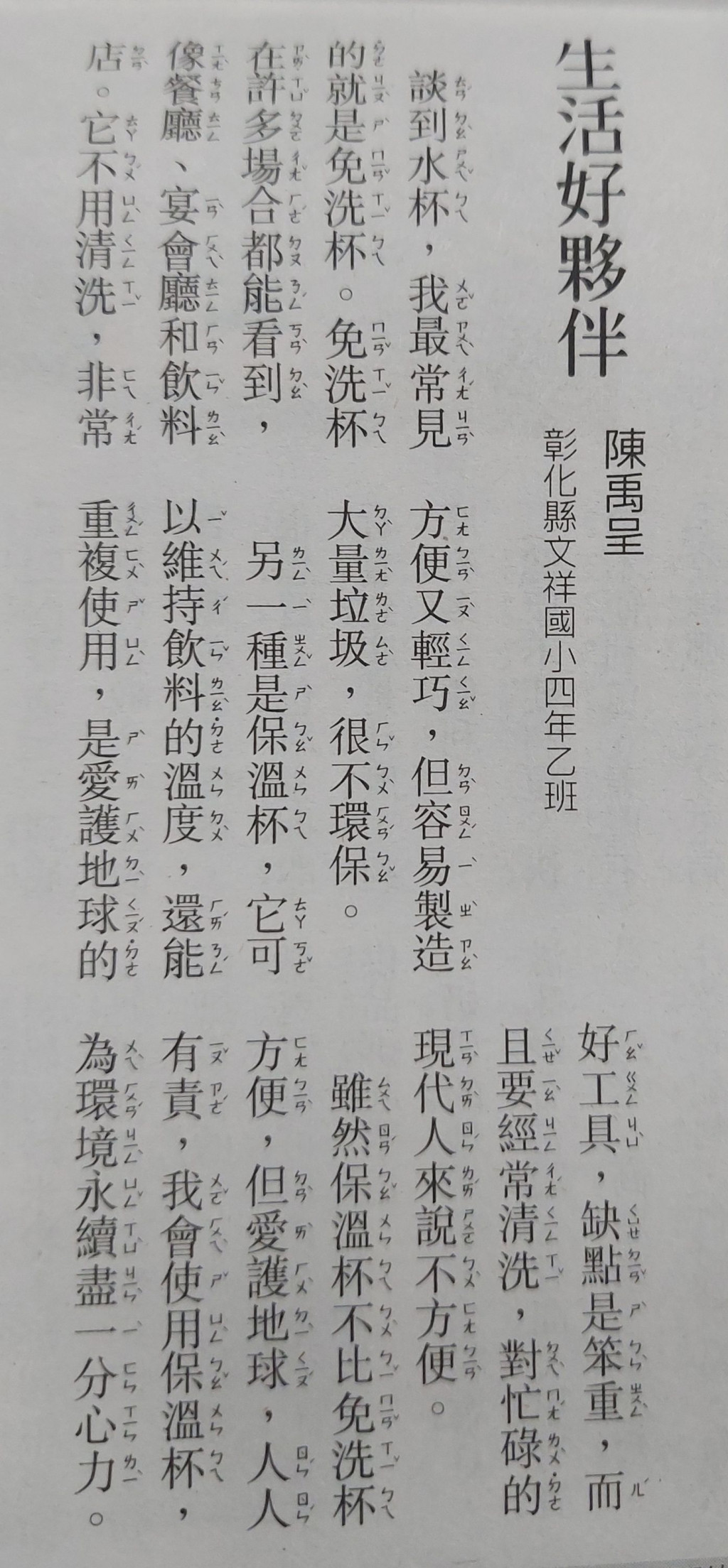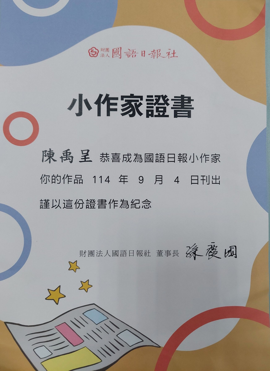 114/9/4 四乙陳禹呈 投稿國語日報 榮獲刊登及小作家證書一紙