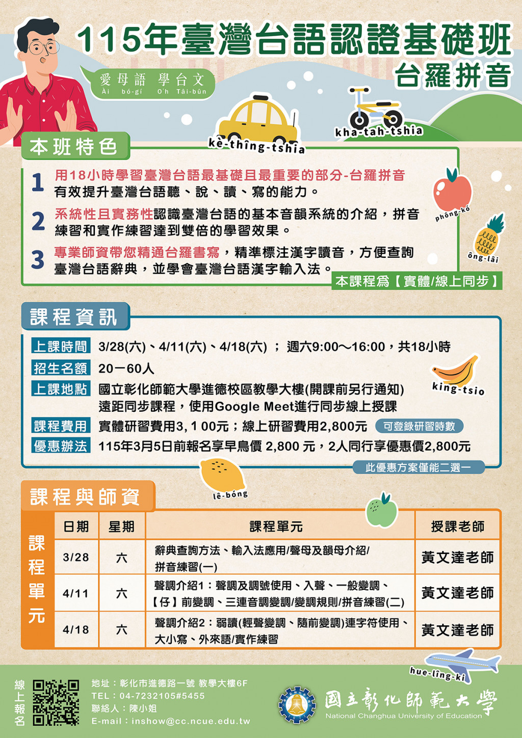 【公告】「115年臺灣台語認證基礎班-台羅拼音」、「115年臺灣台語能力認證考試輔導班」課程